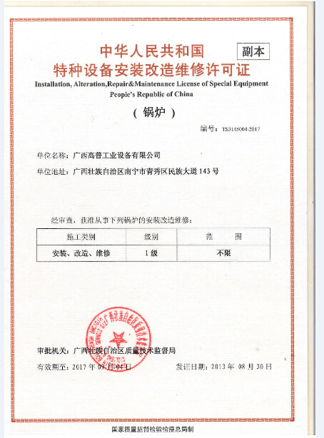廣西高普工業(yè)設(shè)備有限公司的前身是南寧高普熱能設(shè)備有限公司,是一家成立于1998年,具有獨(dú)立企業(yè)法人資格的的有限責(zé)任公司。公司總部設(shè)在廣西首府南寧。在云南、宜賓等多處地方、地區(qū)設(shè)有辦事及分公司。 本公司是高新技術(shù)企業(yè),持有國家技術(shù)監(jiān)督局頒發(fā)的1級《特種設(shè)備安裝、改造、維修(鍋爐)》許可證,1級許可證是最高級別,可安裝、改造、維修任何形式、參數(shù)的鍋爐設(shè)備。并持有《壓力管道》安裝、改造維修許可證,1級《壓力容器》安裝、改造、維修,機(jī)電設(shè)備安裝工程專業(yè)承包3級等資質(zhì)。 公司擁有雄厚的人力資源和技術(shù)裝備力量。在現(xiàn)有正式員工中,鍋爐及相關(guān)專業(yè)工程技術(shù)人員55名,其中高級工程師10名,工程師32名。持證焊工55名,持有合格項(xiàng)目七十多項(xiàng)次,項(xiàng)目中包含了一類鋼種和二類鋼種的各種形式的電弧焊及氬弧焊。無損檢測人員11人,Ⅲ級2人,II級9人,項(xiàng)目包括含常規(guī)四種探傷方法。機(jī)電設(shè)備安裝專業(yè)工程人員58人,撻有相關(guān)專業(yè)證書涵蓋40多項(xiàng)專業(yè)項(xiàng)目。其中:宜賓分司駐有員工108人,其中工程技術(shù)人員23人,高級工程師3人,工程師7人,助理工程師13人,持證焊工20人,II級無損檢測人員5人。 本公司多年專業(yè)從事鍋爐設(shè)備的安裝、改造、維修工作,擁有多名業(yè)內(nèi)知名的鍋爐專家,有技術(shù)過硬的施工隊(duì)伍,在制糖行業(yè)、造紙、發(fā)電行業(yè)等領(lǐng)域,有良好的聲譽(yù)。..詳細(xì)